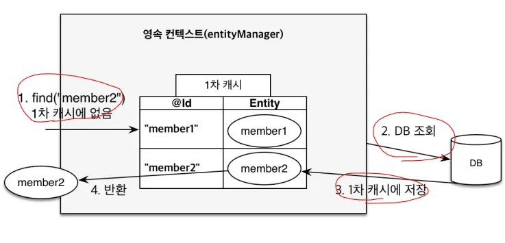 데이터 조회 시, 영속성 컨텍스트에서 우선 조회 한다. 동일한 트랜잭션 내에서 저장한 데이터거나 이미 조회한 데이터라면, 영속성 컨텍스트의 엔티티를 사용하여 DB에 중복된 쿼리로 불필요한 액세스를 줄일 수 있다.