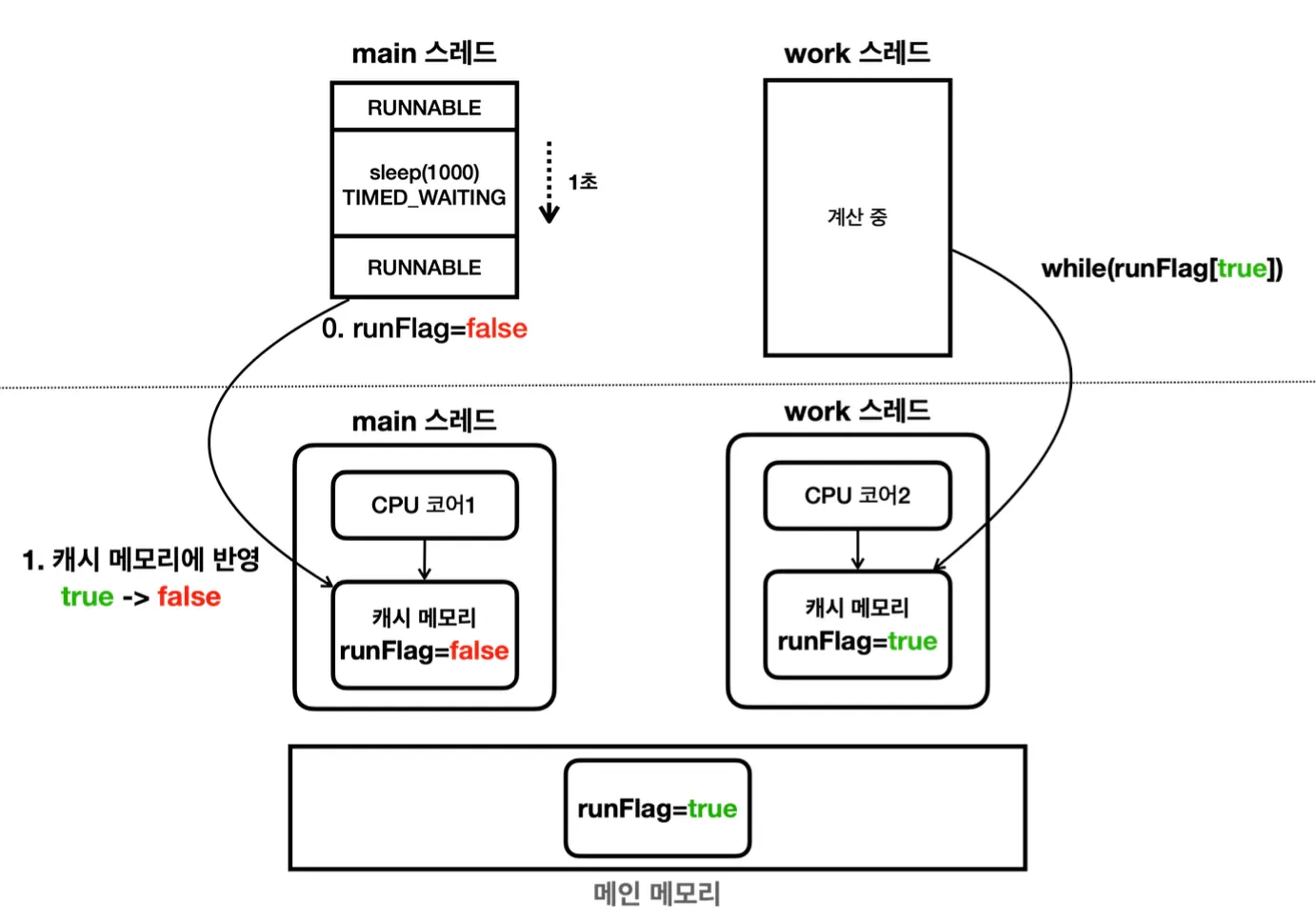 main 스레드에서 변경한 runFlag 값은 main 스레드의 캐시 메모리에만 적용이 된 것이고, work 스레드 캐시 메모리에는 동기화되지 않은 것이다.