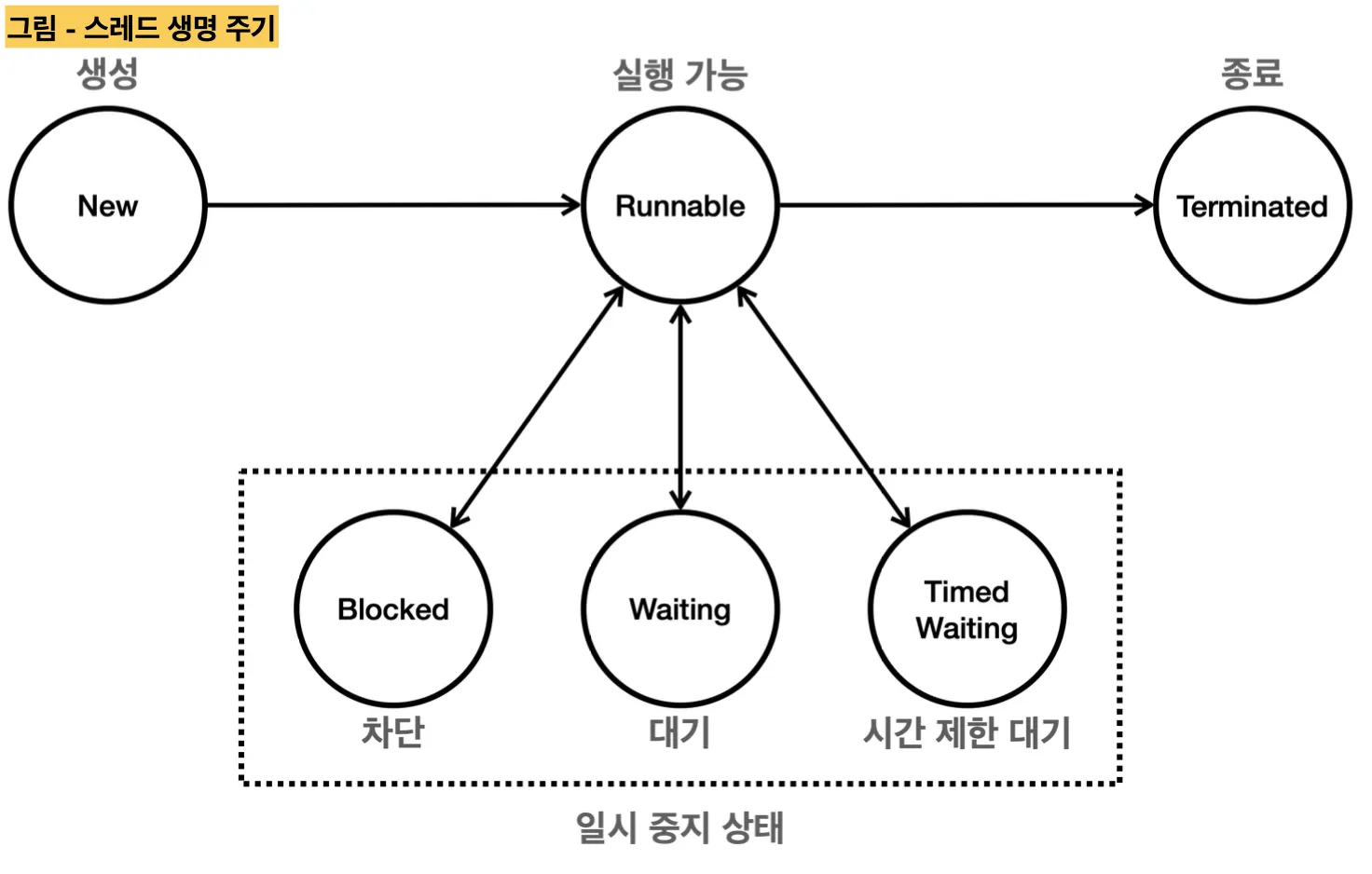 자바 스레드의 생명 주기는 시작부터 시작하여 실행, 일시 중지, 종료의 상태를 갖고 있다.
