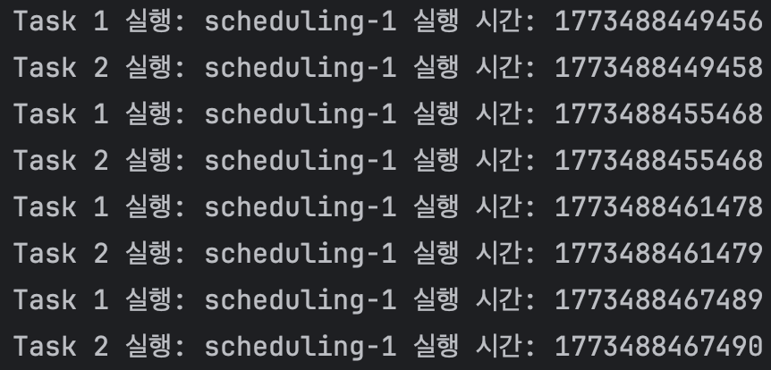 로그를 통해 알 수 있듯 Task2는 Task1의 작업과 관계없이 1초마다 병렬적으로 실행되는 것을 볼 수 있다.