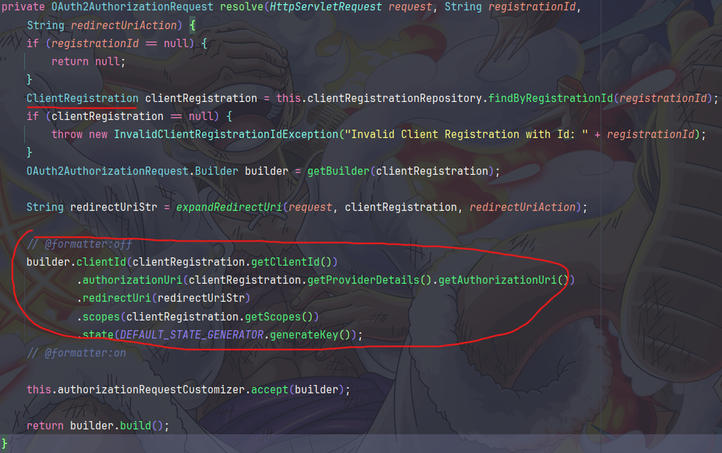3. DefaultOAuth2AuthorizationReuqestResolver라는 녀석을 통해, 설정한 yaml 파일의 정보들(ClientRegistration)을 갖고와서 OAuth2AuthorizationRequest 객체에 넣어주고, 세션에 저장한다.